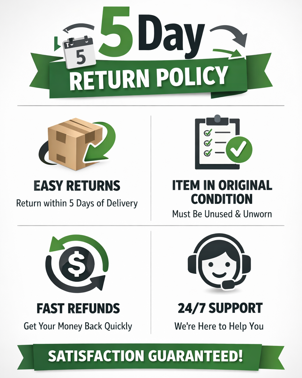 If you're not satisfied with your purchase, you can return it within 5 days of delivery — simple and hassle-free.